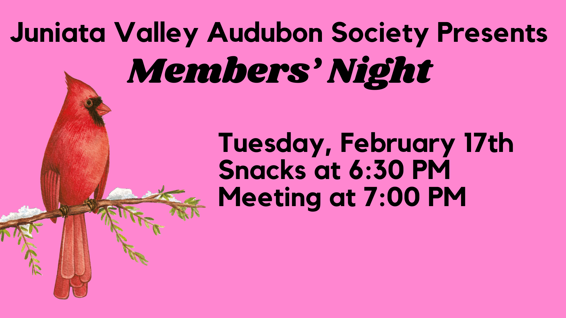 Audubon’s annual Members’ Night is always a good time, with lots of socializing and an impressive assortment of slideshows, videos, wildlife art, nature poetry, nature crafts, and other by-products of our on-going fascination with the natural world. Email Michael Kensinger by Tuesday, Feb. 10 if you’d like to make a presentation, which should be no longer than 10 minutes: MichaelKensinger@gmail.com or call/text 814-505-3410.