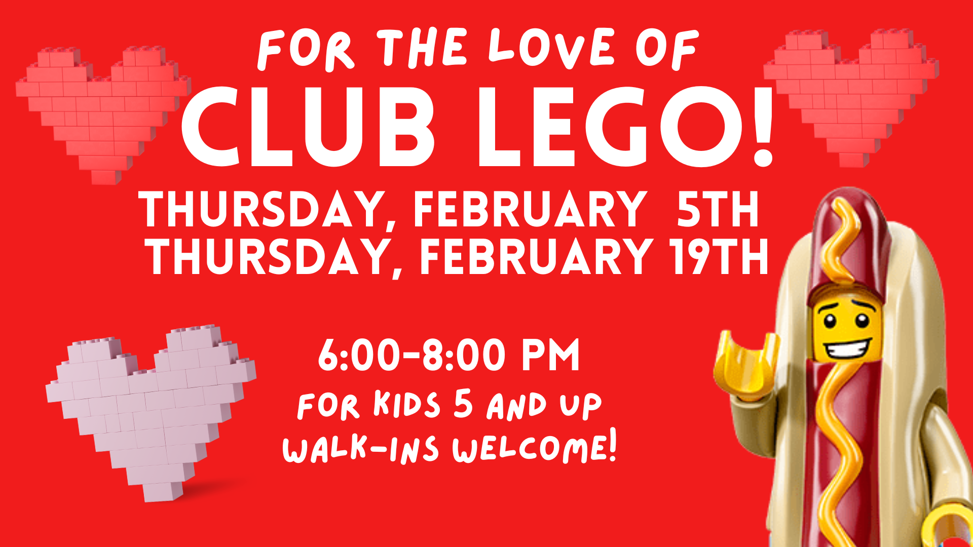 WE LOVE LEGOS! Kids ages 5 and up are invited to join us for an evening of Lego freestyling on Thursday, February 5th and 19th from 6-8 PM on both dates. No sign ups are needed, but we ask that a grown-up stay in the library while children build.