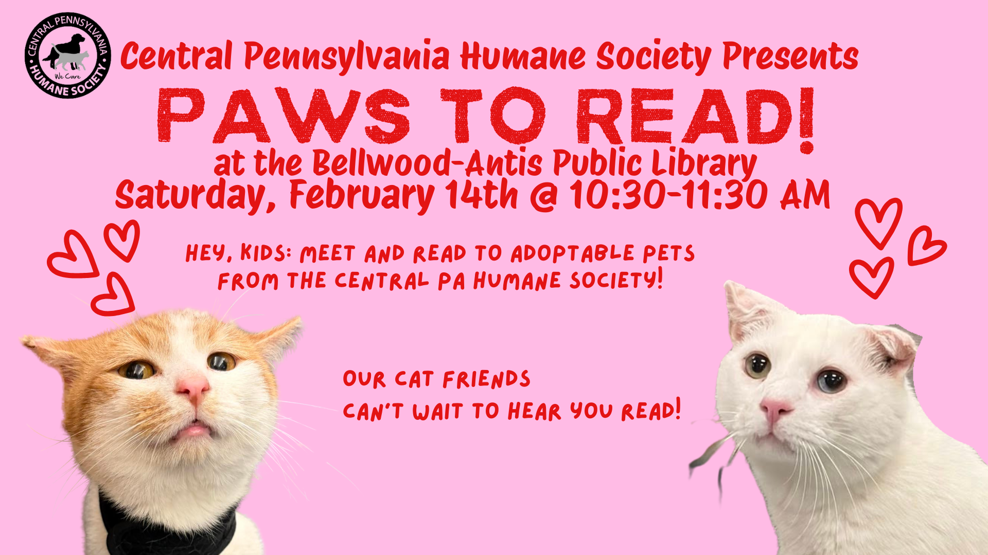 We present a PAWS to Read session on Saturday, February 14th from 10:30-11:30 AM. Kids will meet and read to an adoptable cat friend from the Central PA Humane Society. Reading to animals is an ideal way for children who may struggle with reading to build skills while hanging out with a non-judgmental animal friend.