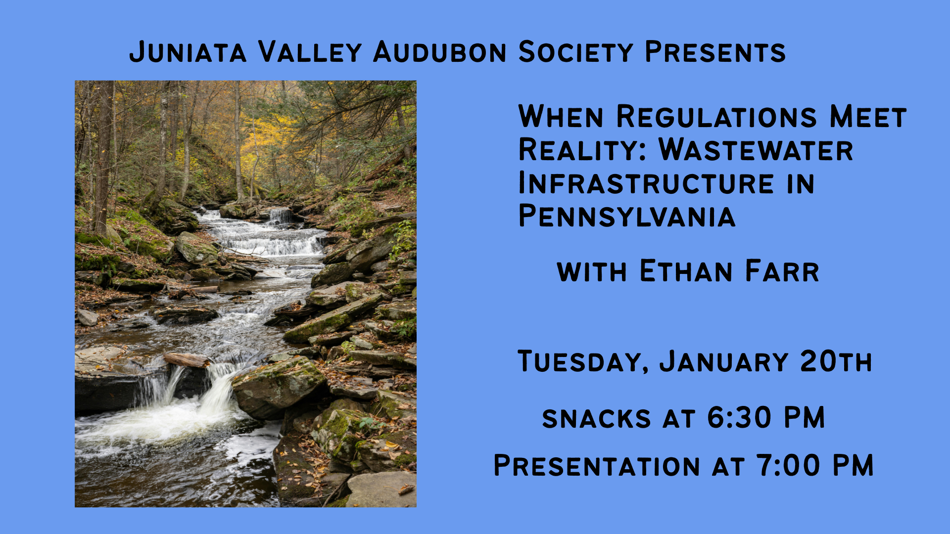 This presentation at Audubon’s January meeting on the 20th will examine recent and proposed DEP regulatory changes and how these shifts affect municipal systems, operators, and long-term planning. We will also explore the connections between failing wastewater infrastructure and Pennsylvania’s fisheries, highlighting how system failures contribute to habitat degradation.